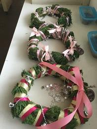 この後、リボンを巻き、校庭で集めてきたマツボックリやドングリ、100円ショップで購入したベルやボールなどで装飾を行います。