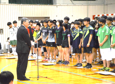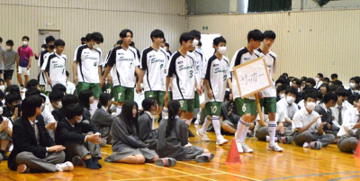 全校生徒の拍手の中、各部ごとに1列で入場してから部長がマイクで大会に向けての意気込みを語りました。続いて学校長、生徒会長による激励、最後に各部を代表して、ハンドボール部3年の篠田さんがお礼のことばをのべました。