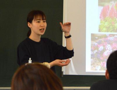 柳澤先生はスライドで花の種類や特徴、土や植え付けのコツを教えてくださり、