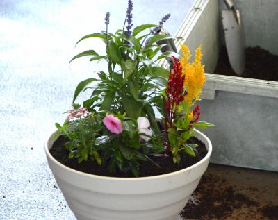 参加者それぞれに好きな色の花苗を4つ選び組み合わせて寄せ植えを楽しみました。