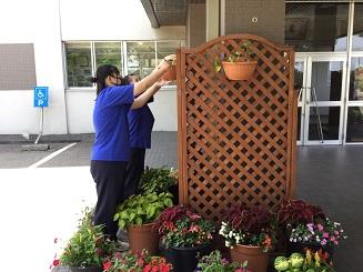 さて、先週、正面玄関にハンギングバスケットを設置しました。