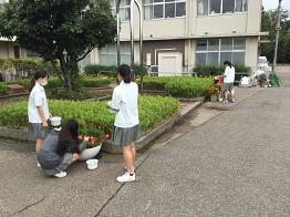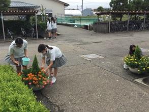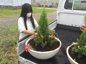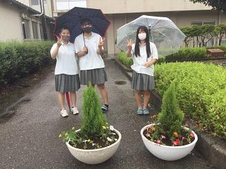 大型プランターにお花を植え、生徒玄関に飾りました。