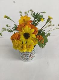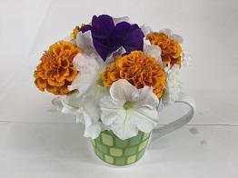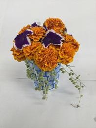 黄色のマリーゴールドは、白いペチュニアと組み合わせることで、クールなイメージに仕上げました。