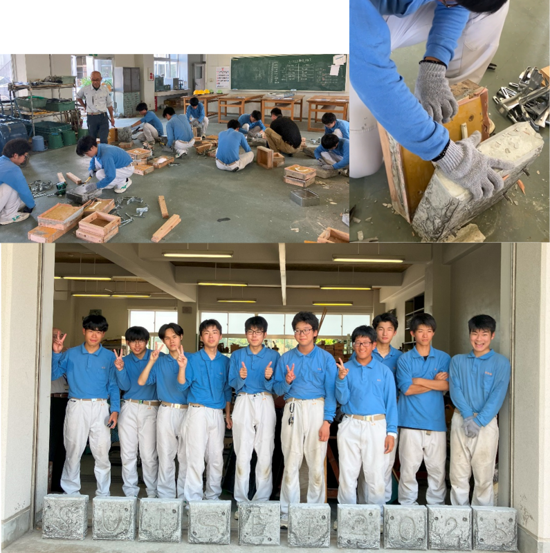 最後の実技指導は、前回コンクリートを打設した型枠を解体しました。取り出したコンクリートには、型枠製作の際に埋め込んでおいた目地棒により、ローマ字や数字が刻まれています。完成したコンクリート平板を順に並べると、「SUISEI2025」という言葉になり、全員で記念撮影をしました。