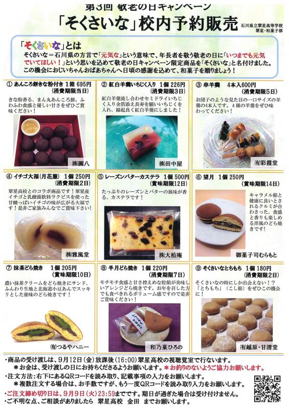 道の駅「めぐみ白山」では、9月15日(月)限定で各店舗の「そくさいな」商品を購入することができます。