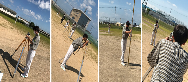 環境科学コース(環境設計分野)は、グランドで測量実習。