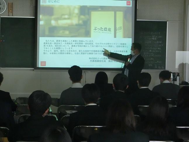 1年次「産業探究」の一環で、(株)ぶった農産 代表取締役社長 佛田利弘 氏に講演していただきました。