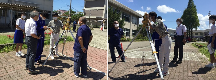 いよいよ、夏本番となりました。環境設計分野の総合実習では、石川県高等学校測量技術検定試験に向けて、角測量の練習をしています。本校では、環境設計分野の生徒全員が2年次に水準測量検定を、3年次には角測量検定を受験します。角測量検定内容は、セオドライトを格納箱より取り出し、与えられた三点の各測角を一対回単測法にて測定し、野帳に記載した上、器械を格納箱に納めるまでを検定する試験です。外業時間17分以内かつ許容誤差1分40秒以内での中級合格を目標とし、実習に励んでいます。