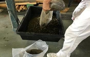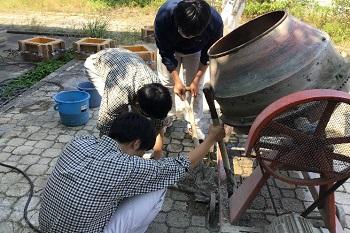 まず、型枠3つ分のコンクリ―ト量として、水を5L、セメントを9kg、石や砂利を適量準備し、コンクリートミキサーで掻き混ぜました。約6分でコンクリートが完成し、型枠内にコンクリートを流し込みました。一週間後、固まったコンクリートを見るのが楽しみです。