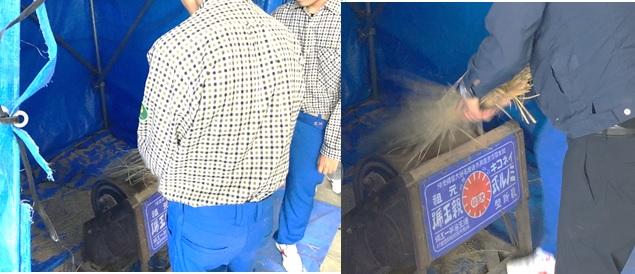 作物班の女子生徒は、唐箕(とうみ)と呼ばれる農機具により、風を使って、藁くずやゴミを吹き飛ばす工程を行いました。