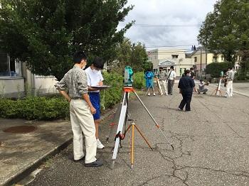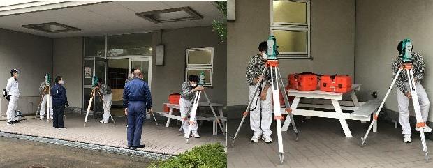 環境設計分野は、実習棟玄関前で、測量機器(セオドライト)の設置実習を行っていました。生徒たちは、全集中で微妙な調整をしながら、正確に機器の設置をしていました。
