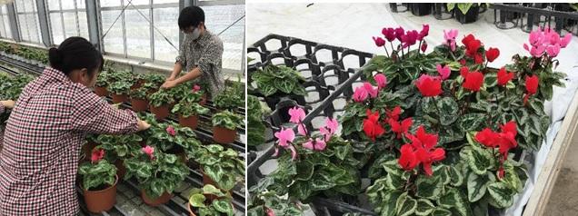 草花温室では、草花班が、植え替え作業やシクラメンの手入れが行っていました。