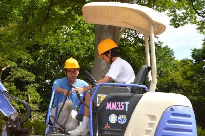 環境科学コースは「建設機械を操縦してピン倒しにチャレンジ」、
