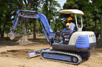 油圧ショベルの操作方法を習い、高校生と実車に乗って操作を行いました。