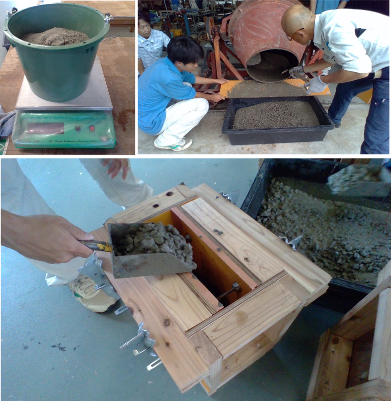 6月23日(月)の総合実習では、製作した型枠にコンクリート流し込む実習を行いました。5限目は、コンクリートの材料である砂利、砂、水やセメントの計量を行いました。マイスターからは、「空気中に舞込んだセメントを肺が吸い込むと、炎症の原因にもなるため、軽量時は丁寧に移し替えるように。」とのアドバイスをいただきました。