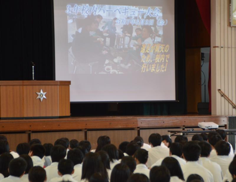 ビデオ視聴では、田植えやバーベキュー、意見発表会、野球の応援など教室以外の活動の様子を、音楽とともに振り返りました。
