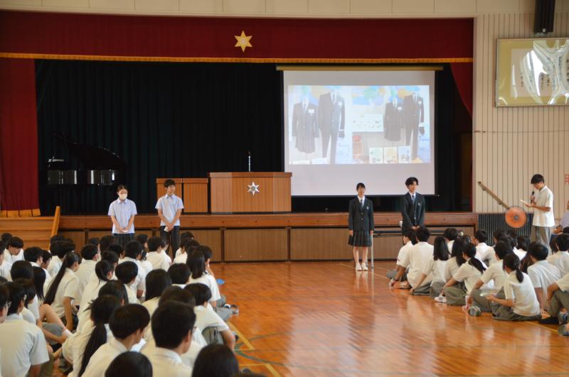 新制服の披露では、軽快な音楽に合わせて制服検討委員会のメンバーである生徒たちが新制服を着て登場し、全校生徒の間を歩き、スライド写真でこれまでの会議の流れ(業者の選択からデザインの決定まで)を説明しました。