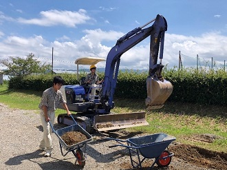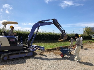 環境設計分野の生徒がバックホーを使って敷地内の道路工事をしていました。体育の持久走コース走路に適した舗装材料を探す研究の一環で行いました。
