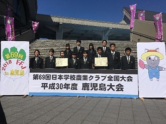 10月24日(水)~25日(木)鹿児島県で「平成30年度 第69回日本学校農業クラブ全国大会 鹿児島大会」が行われました。農業高校生の甲子園とも呼ばれています。本校からはプロジェクト発表会分野Ⅱ類に5名、平板測量競技会に3名、農業鑑定競技会に1名、クラブ員代表者会議の事例発表に3名が出場しました。