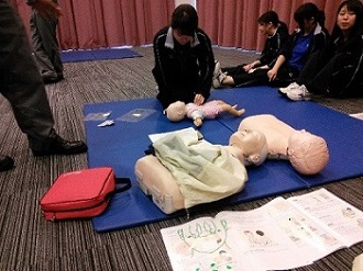 成人・小児・乳児の模型を用いた心肺蘇生法やAEDの使用法、直接圧迫止血法、外傷の手当、搬送法について学んだ後、効果確認を行いました。
