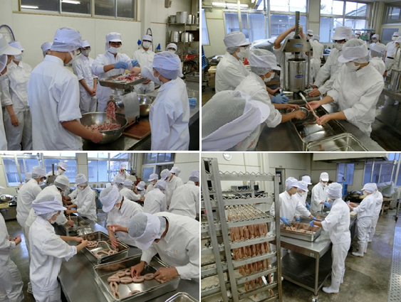 令和3年10月から11月にかけて、2年生の科目[総合実習]でソーセージの製造を行いました。スタッファーを使って羊腸に肉をつめる作業は、羊腸が破れないよう注意しながら進めます。たまに破れてしまったときは急いで止めてやり直す必要があるため、最後の最後で破れたときは悔しかったです。