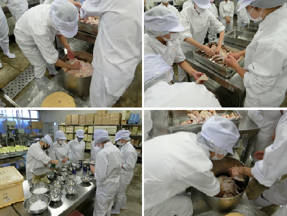 令和3年10月から11月まで2年生の総合実習で燻鶏を製造しました。鶏の毛が細く、見つけずらかったですが、細かいところまで丁寧に毛抜きや置き方など気を付けてできたのでよかったです。燻鶏を試食してみて、香辛料が香ばしく、とてもスパイスがきいていてとてもおいしかったです。