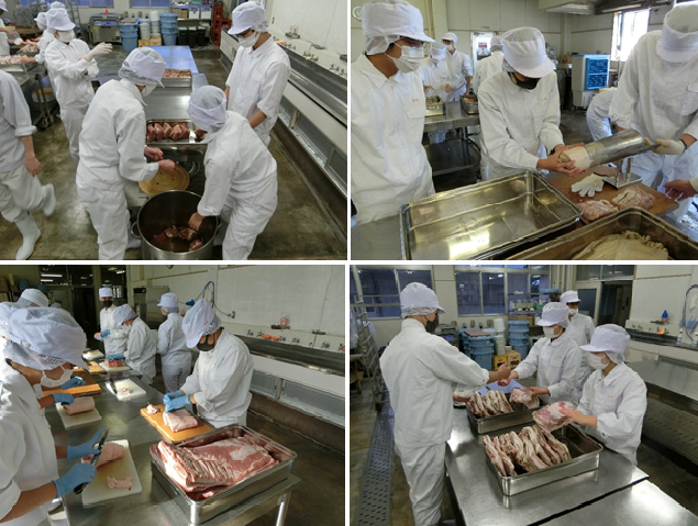 令和2年11月から12月にかけて 科目[総合実習]でボンレスハムとベーコンの製造を行いました。肉をピックル液(香辛料の入った液)に漬け込み、その後、燻煙をして味と香りを付けます。まんべんなくピックル液に漬け込むのがとても大変でした。