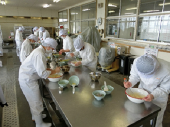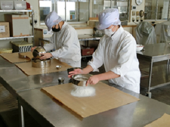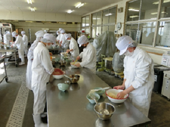 令和3年11月15日月曜日、3年生の科目[総合実習]で大根ずしの本漬けを行いました。程よく塩のきいた大根を甘酒に浸し、ニシン、ニンジン、昆布、ゆず皮、唐辛子等を散らします。この工程を三回繰り返し一週間ほど寝かした後、パック詰めをして完成です。ニシンの鱗が残らないよう目を皿のようにして頑張りました。