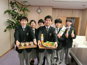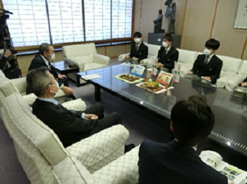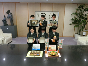 令和4年2月24日木曜日に、3年生の課題研究2班が白山市地産地消連携事業の活動成果を報告しに白山市長のもとへと訪問しました。開発したドレッシングの「JIMODORE」と、日本酒製造の際にでる酒米を利用して開発した甘酒で新たな加工品の開発についての活動成果を報告しました。