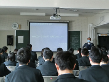 令和4年3月10日木曜日、科目[産業探究]で食品科学コースと農学分野の1年生を対象にHACCP講習会が開かれました。講師としてお越しいただいたのは石川県予防医学協会の川口さんです。私たちがHACCPについて講習を受けるのはこれが初めてでしたが、わかりやすく教えていただきました。