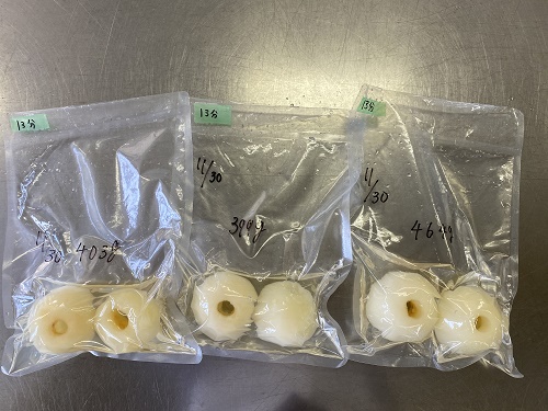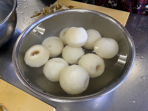 来期から私たちが開発した「松任梨の丸ごとコンポート」を製造してくださる予定の企業の方に本校で製造指導を実施しました。「タマリバかんすけ」(白山市)さんは、白山うどんの飲食店を経営されています。ご夫婦で来校して下さいました。日ごろから食品製造をされている方なので、とても手際よく作業して頂けました。来年からはコンポートづくりお願いいたします!(令和2年11月30日 松任梨班)