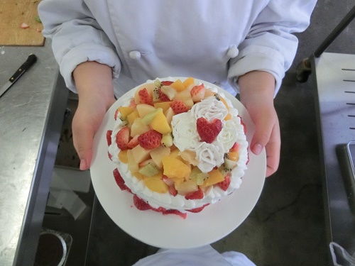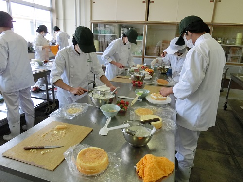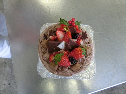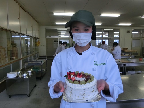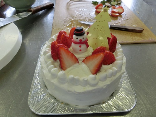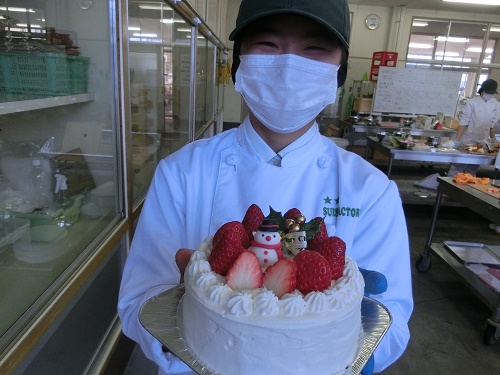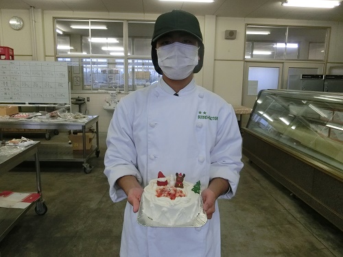 製造練習として、一人2台のクリスマスケーキ作りを行いました。バリエーションに飛んだケーキができました!(令和2年12月23日)