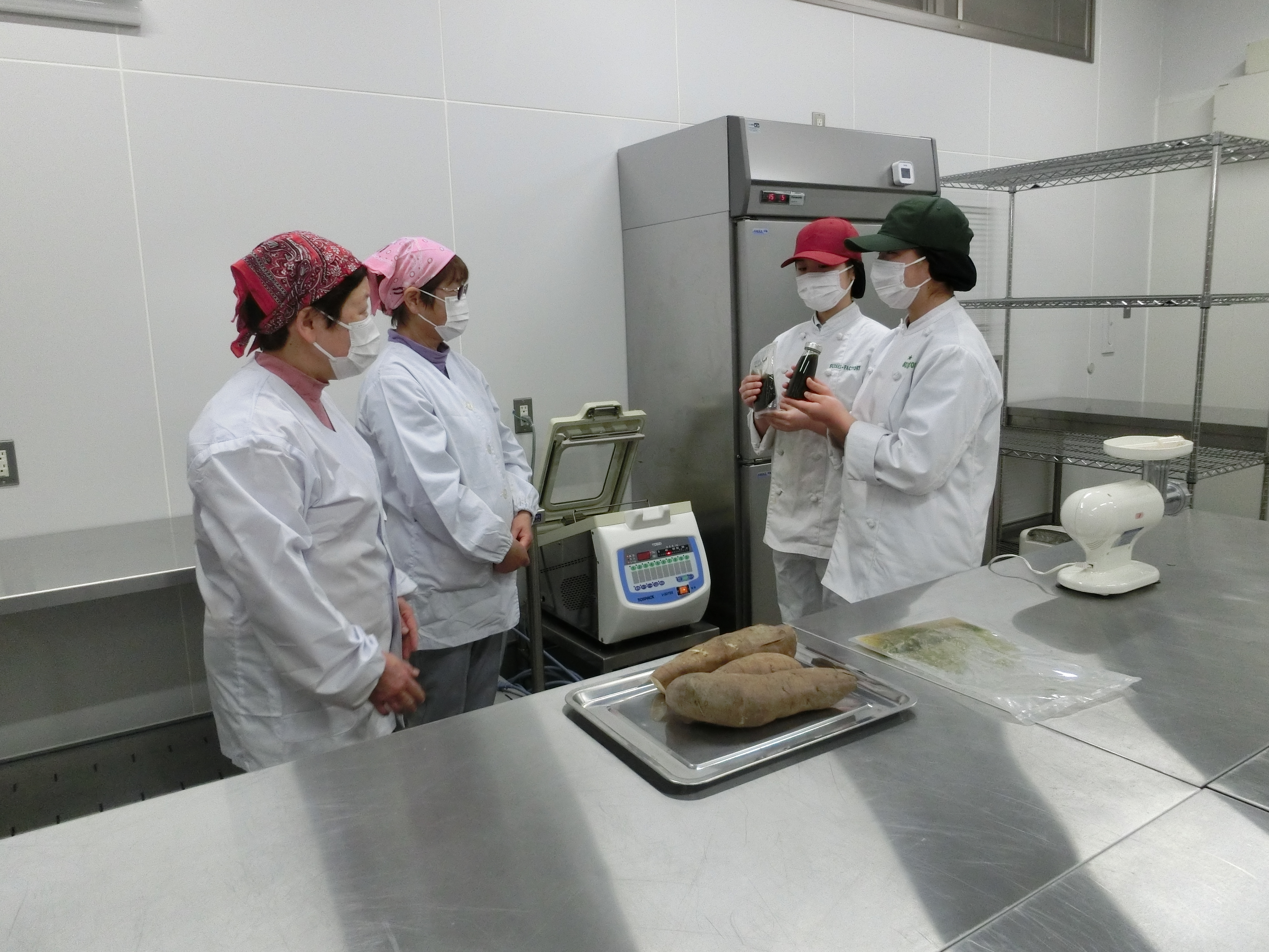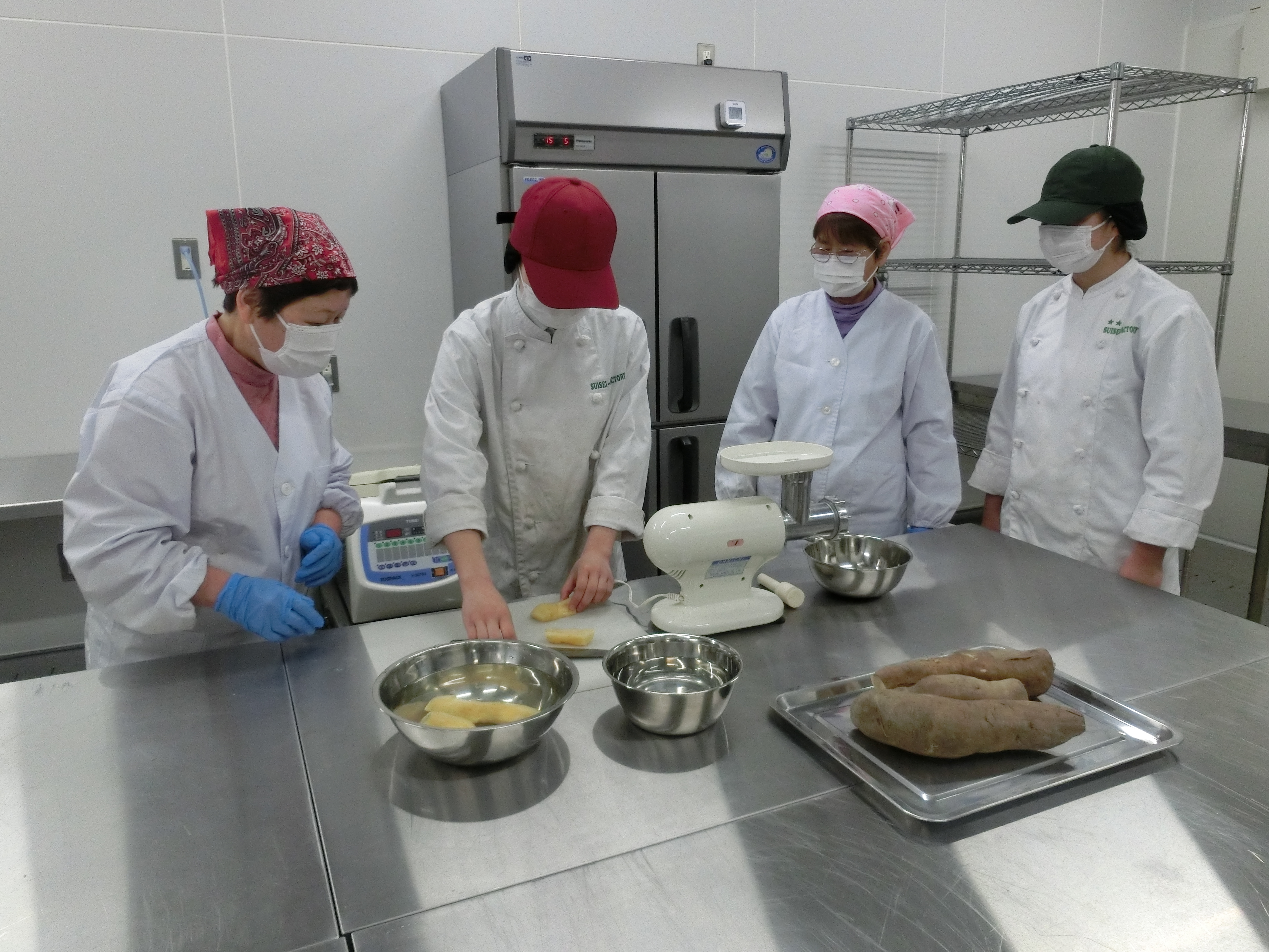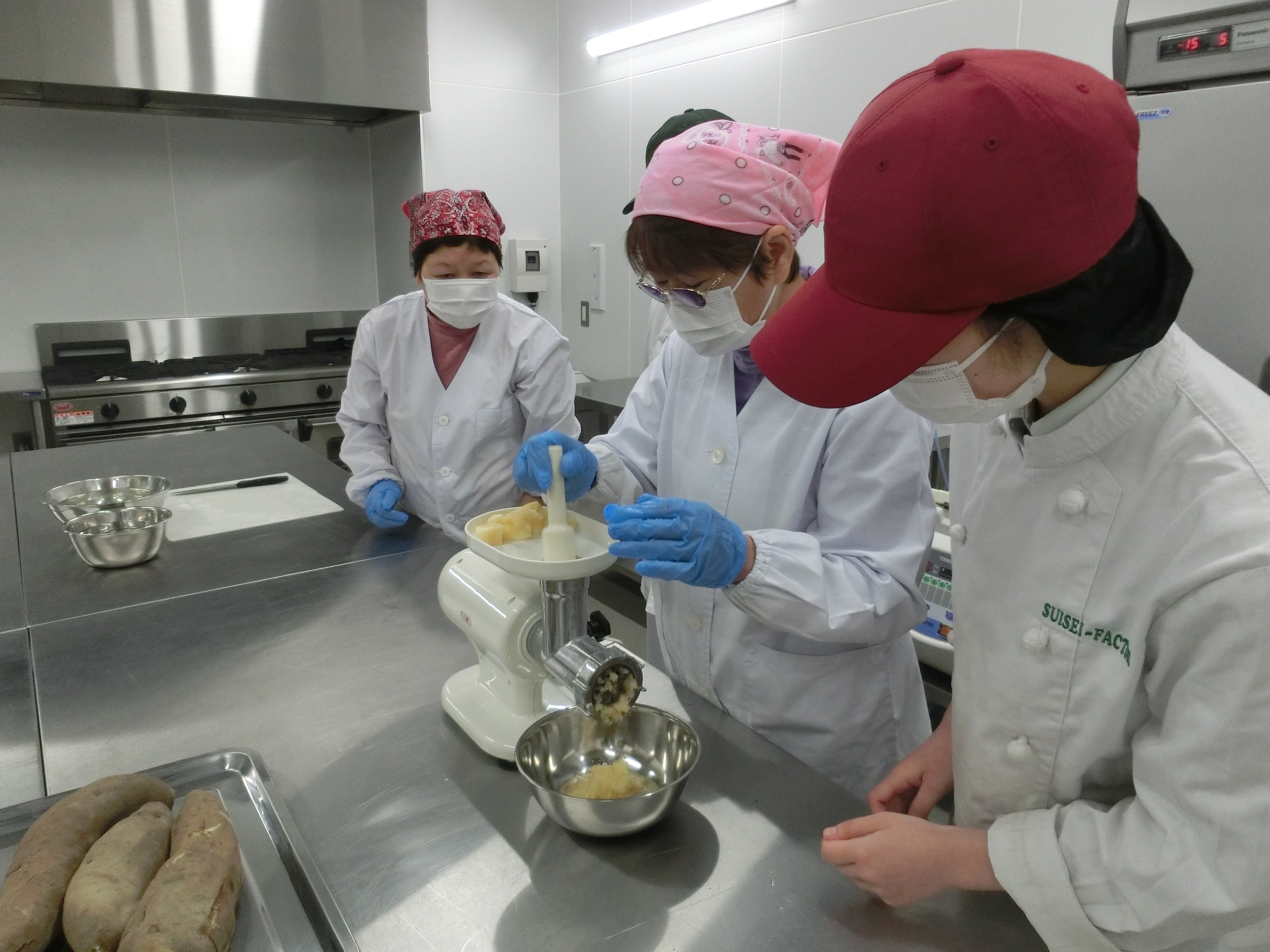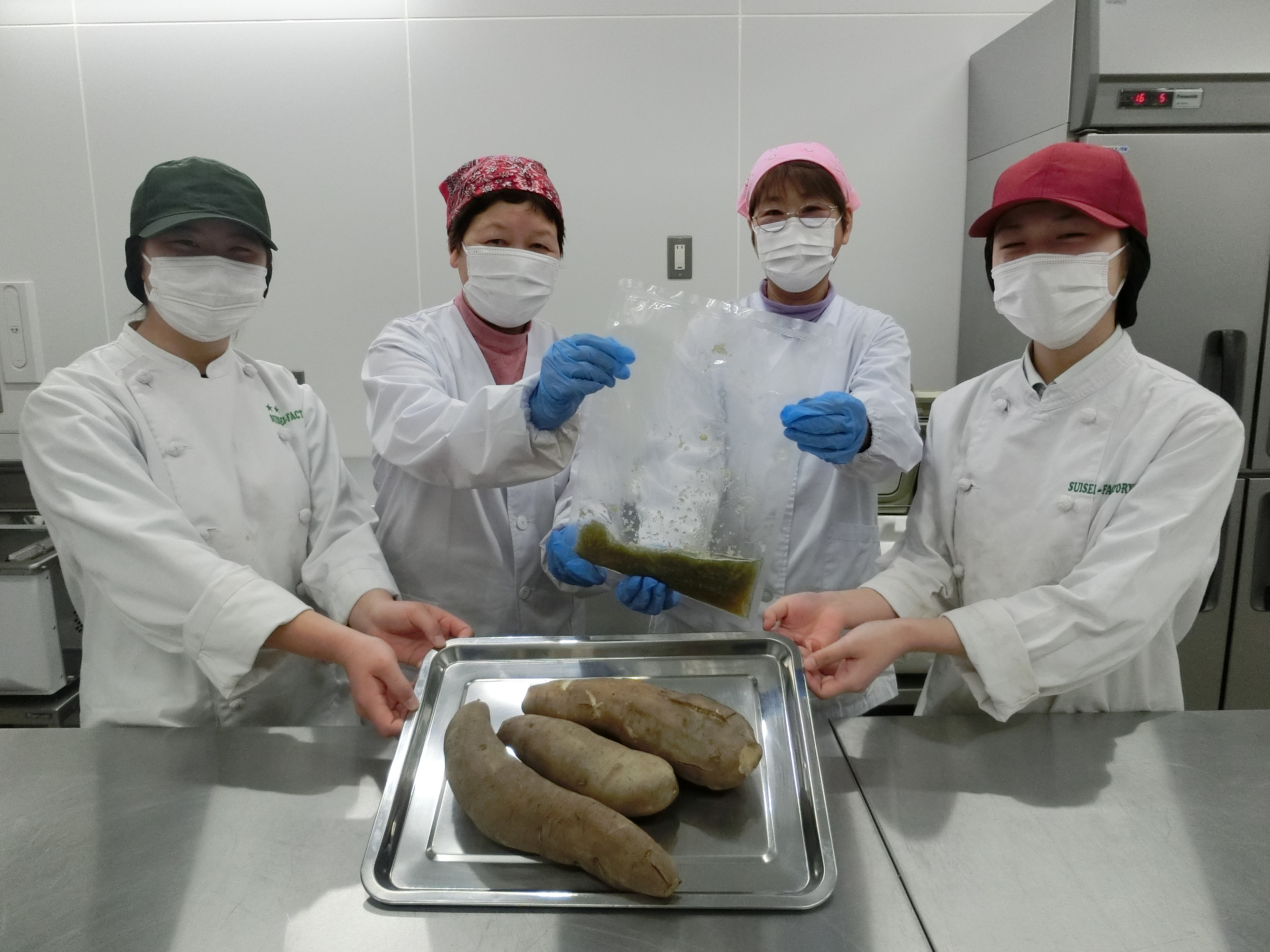 また、来年は生産者が「ヤーコンピューレ」をJA野々市の加工場で製造して納品するとのことで、生産者の方が製造できるか確認するため、加工場で実際にピューレを作ってみました。結果は、家庭用の粉砕機以外は加工場にある設備で製造できることがわかり、生産者は「来年頑張ろう!」と意欲的でした。来年が楽しみです。(2021年3月)