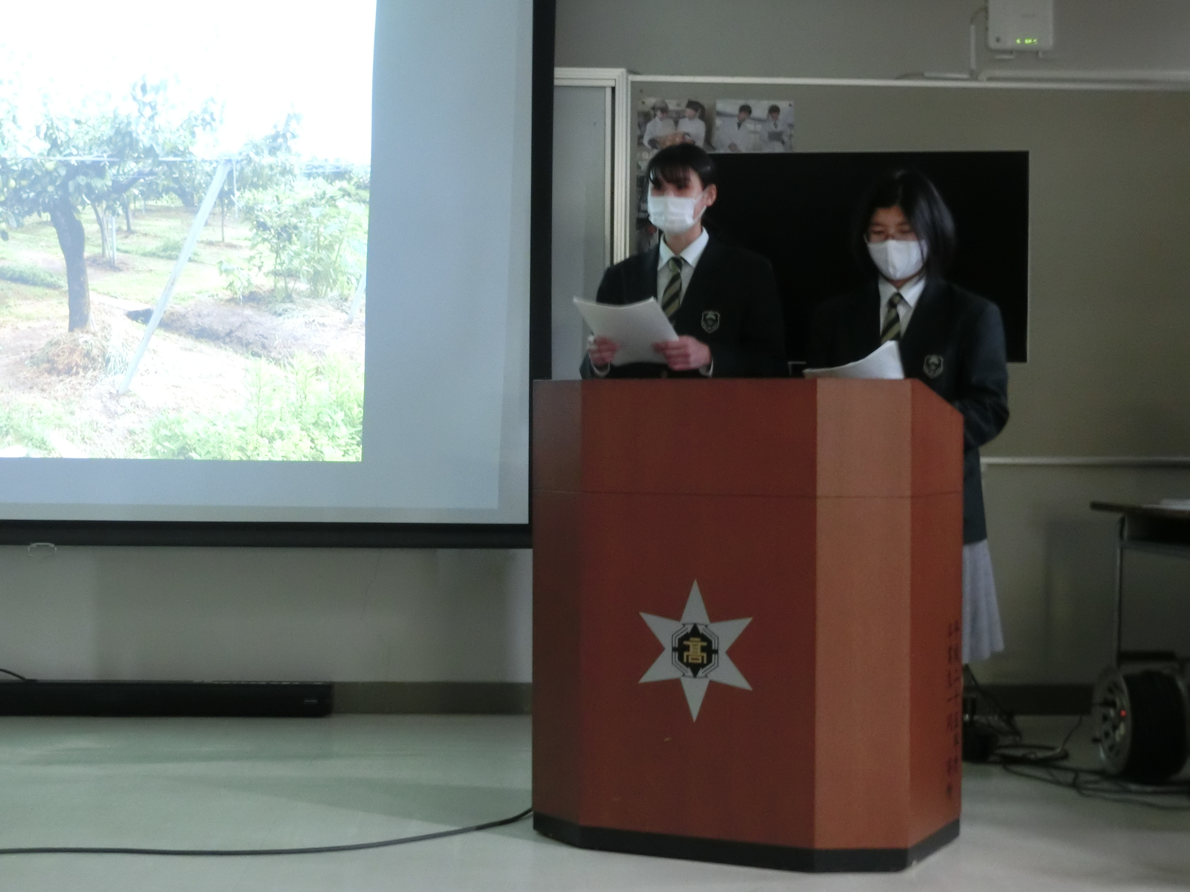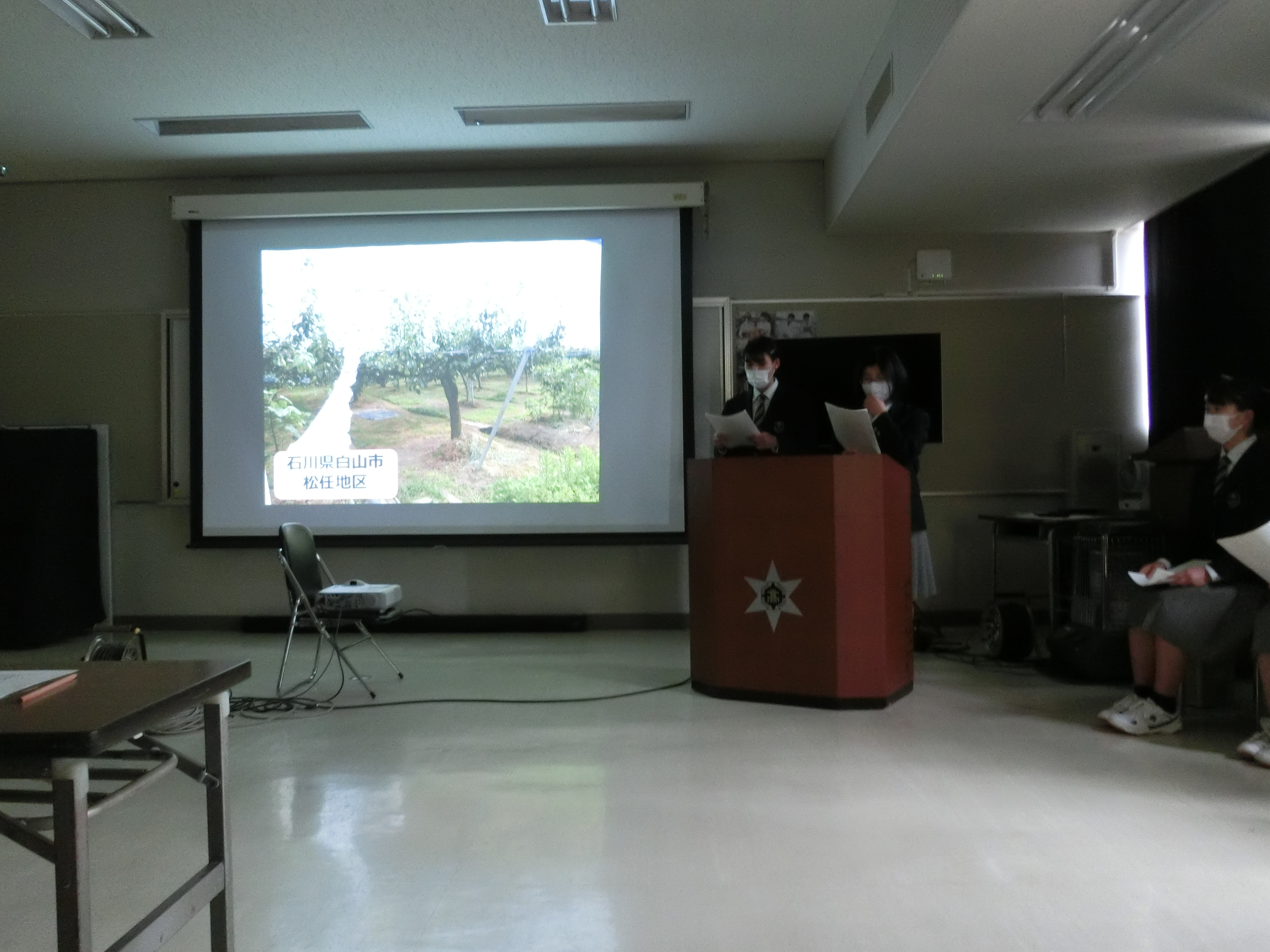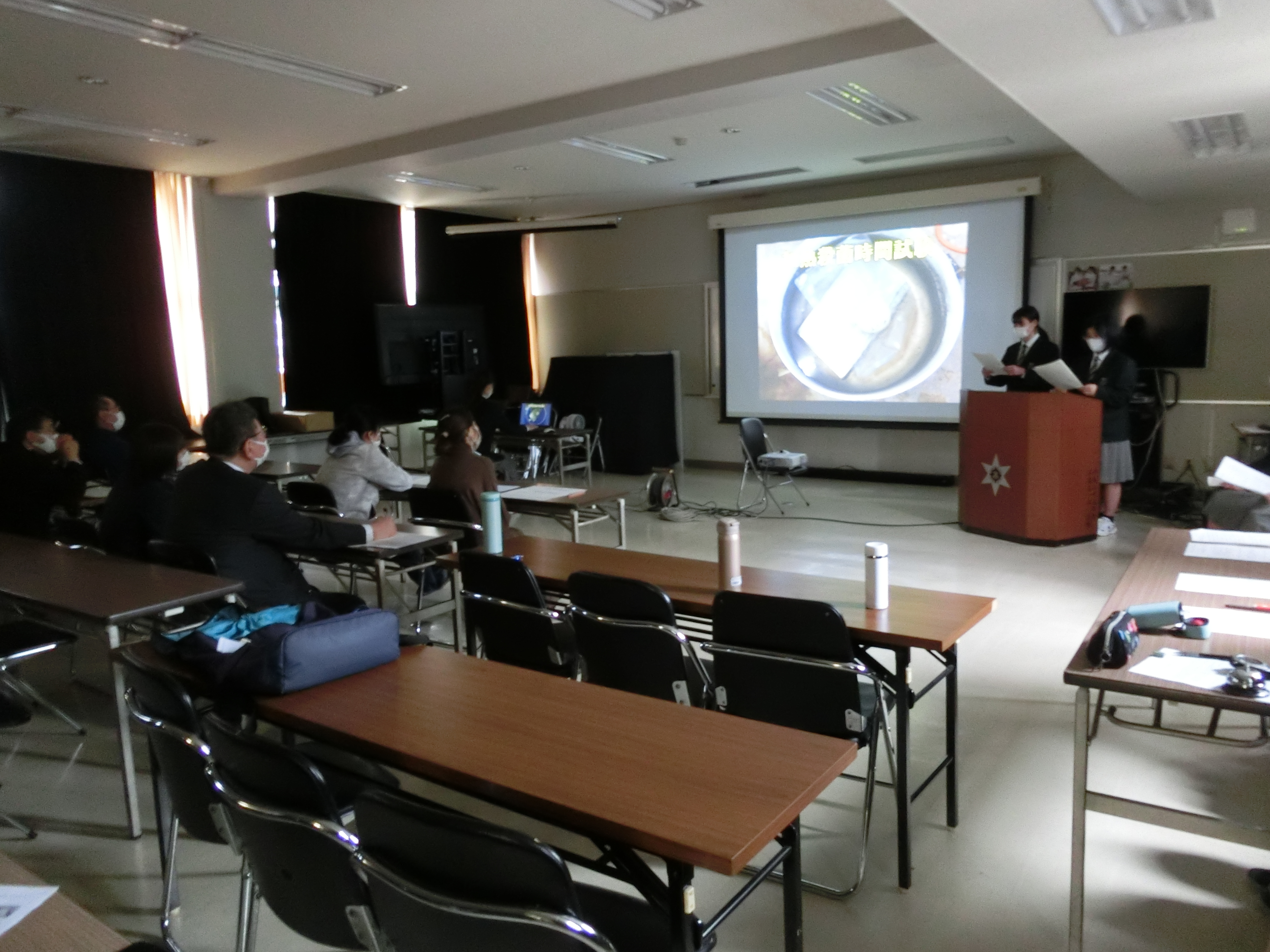 3月25日に農業クラブ校内大会が開催されました。私たち研究会もⅡ類に「松任梨班」Ⅲ類に「HACCP班」の2班出場しました。多くの先生方や農業クラブ役員から質問やご意見を頂き、大変参考になりました。県連大会に向けて頑張っていきたいです。(2021年3月25日)