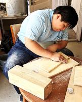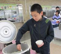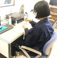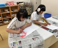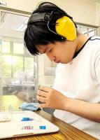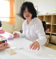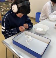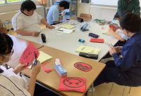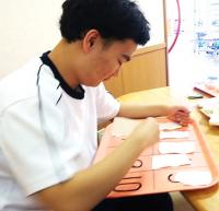 中学部では、作業学習の時間に曜日別で3つの作業に取り組んでいます。キョーワ株式会社様からの委託作業を行う「工芸」、牛乳パックを再利用して製品作りを行う「クラフト」、裁縫やミシンで製品作りを行う「縫工」です。作業だけでなく、挨拶や報告の仕方なども併せて学習しています。