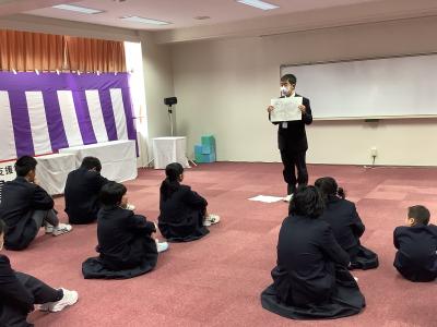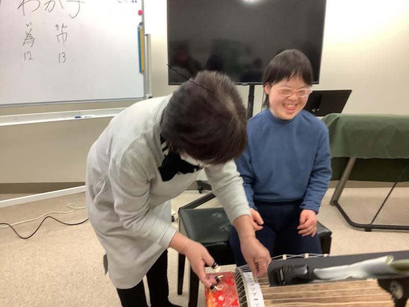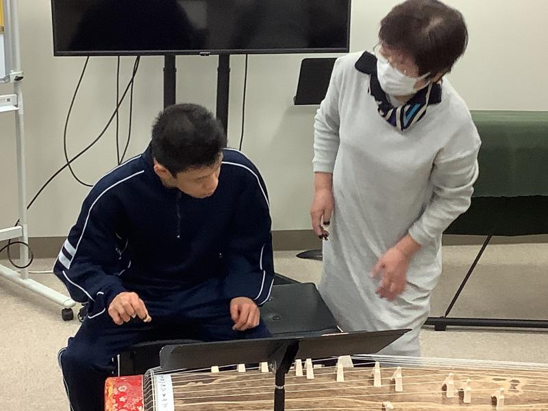 2月20日(火)中学部・高等部の音楽でゲストティーチャーである正院の大句先生のお琴を習いました。大句先生の演奏をみんなで鑑賞して、その後順番に『さくらさくら』を演奏しました。ほとんどの子がチャレンジをして二回目を引きたがる生徒もいました。授業の振り返りでは「ことの音色がとてもきれいでよく響いていました。音が強くなったり、弱くなったりして面白かったです。」等の声が上がりました。大句先生ありがとうございました。