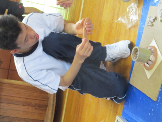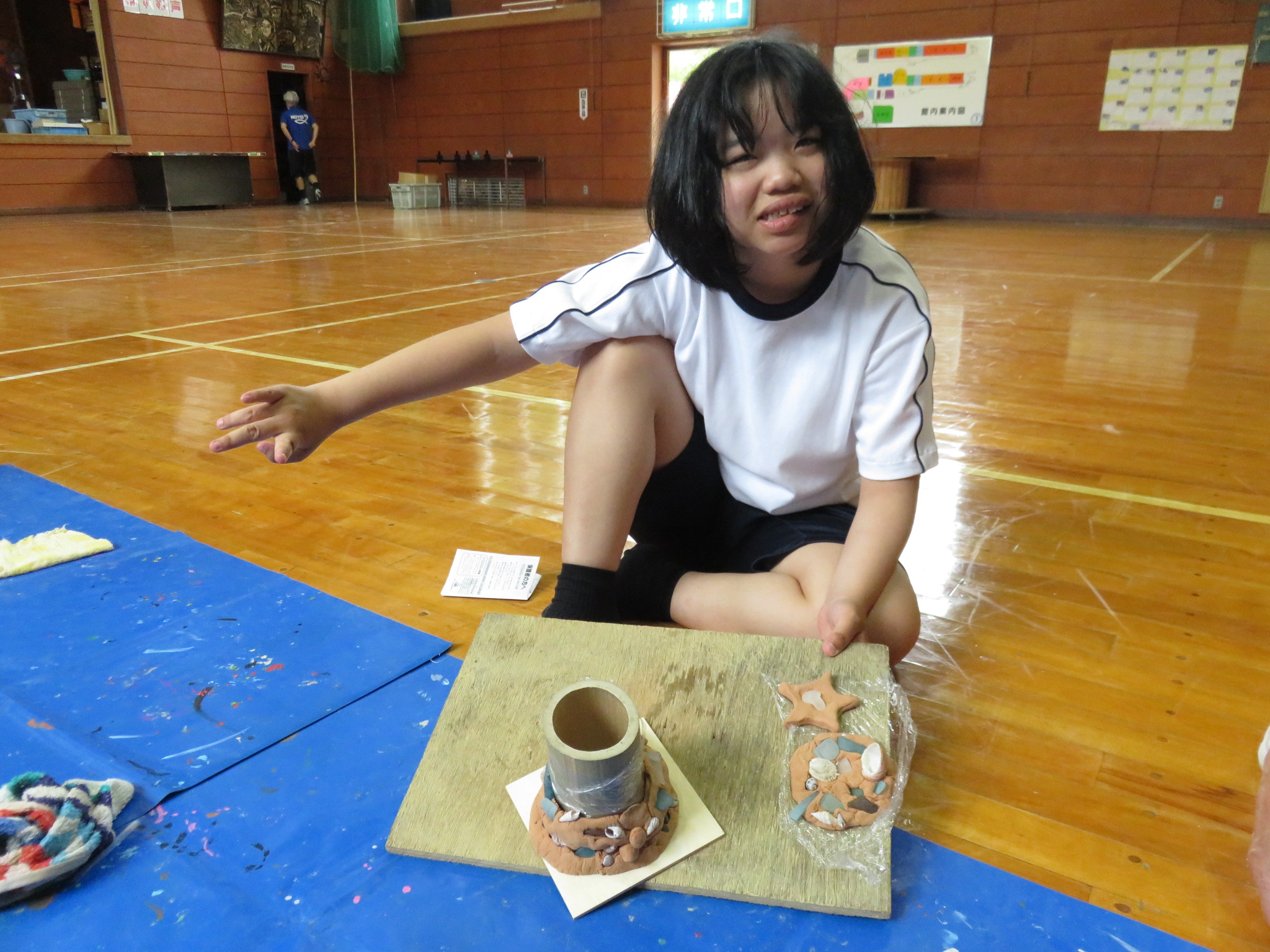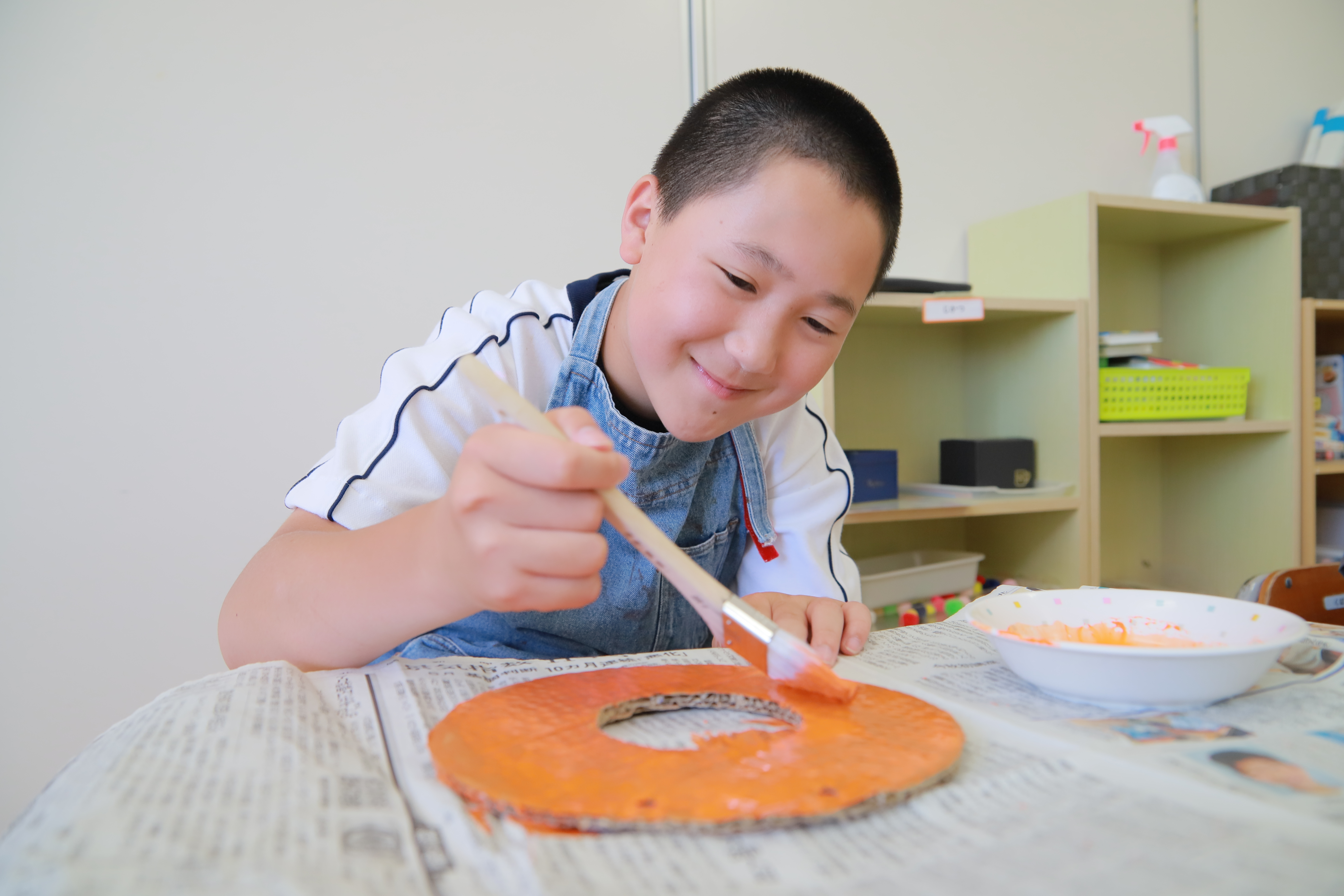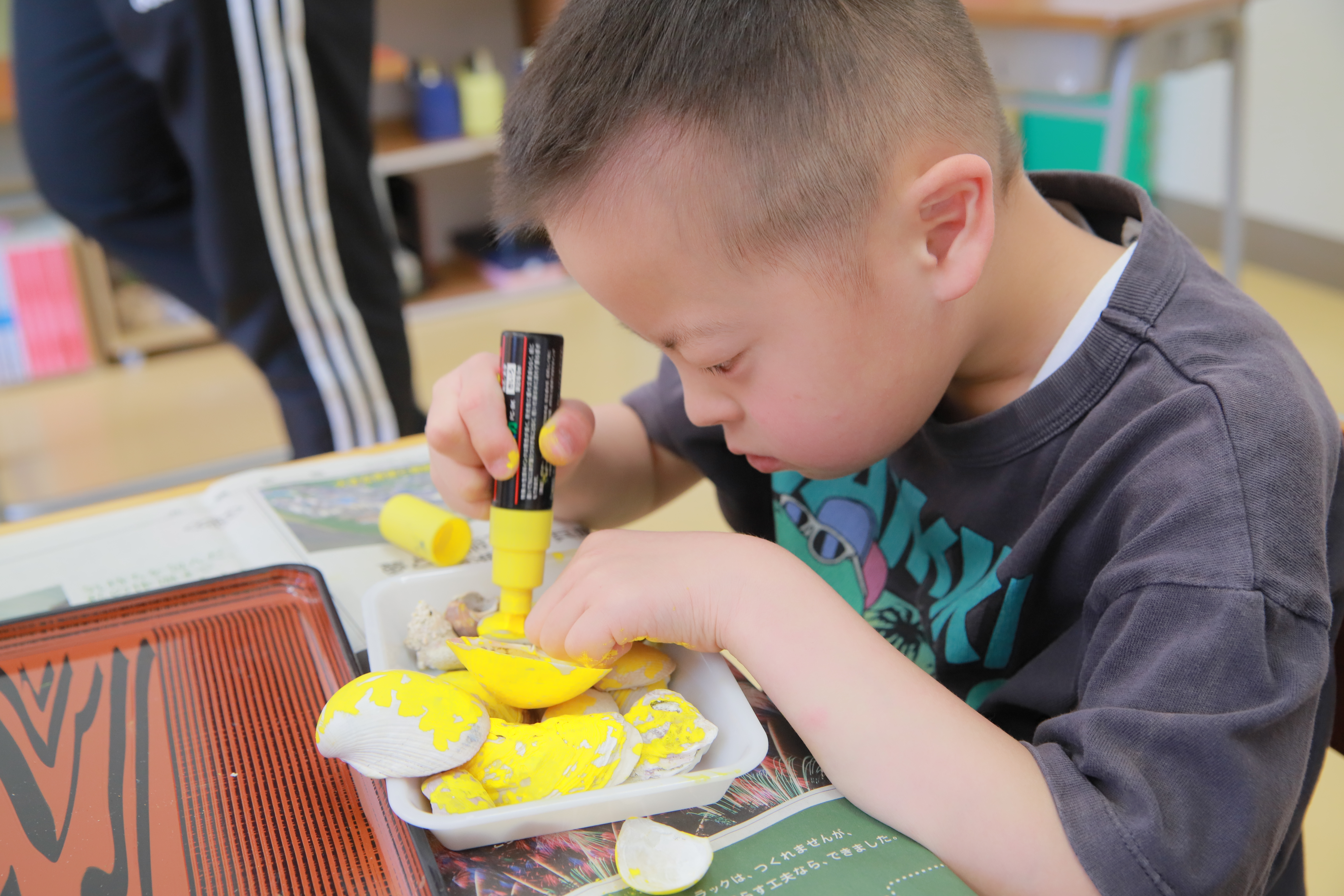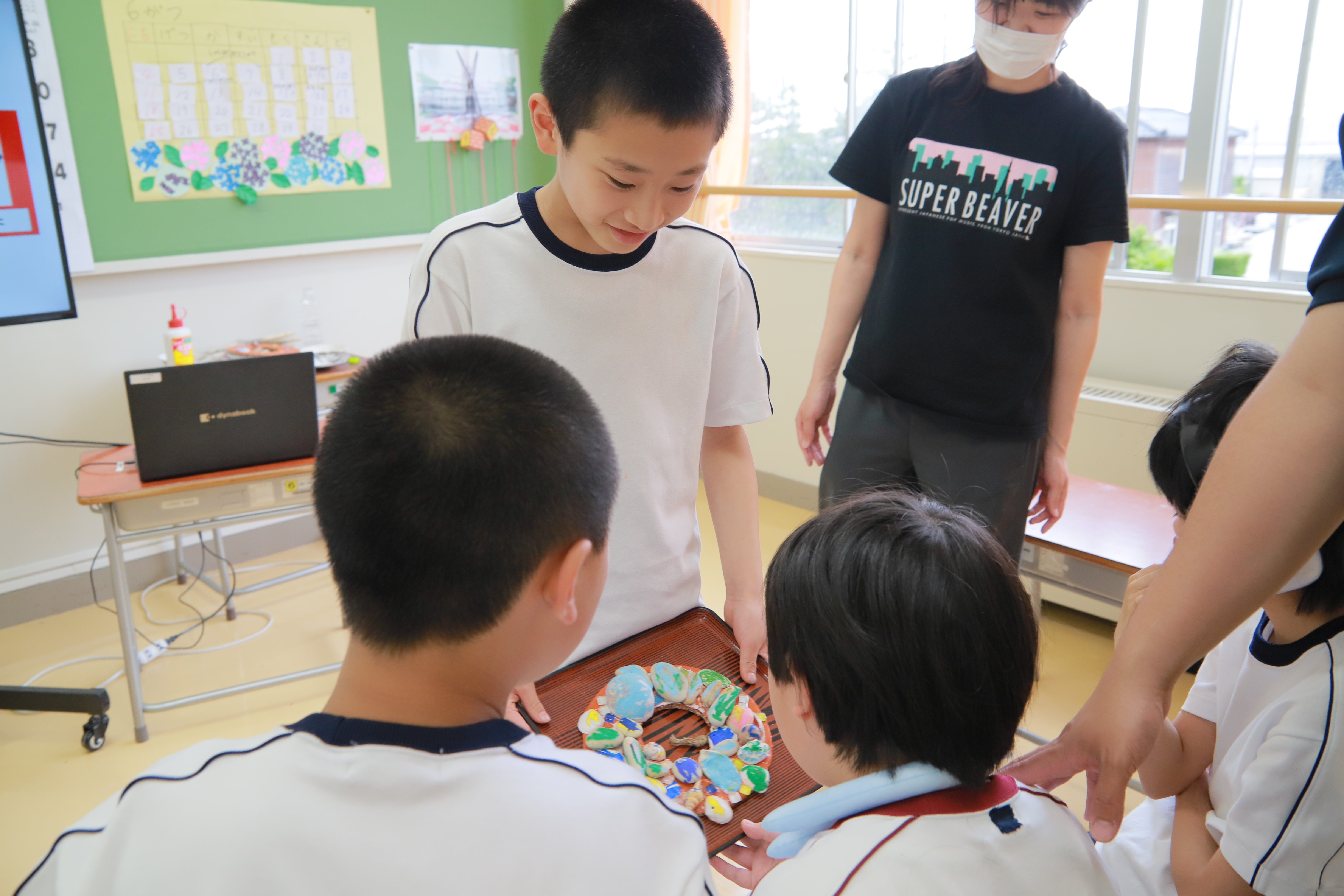 小学部では,海で拾ってきた貝殻を使ってリースづくりにチャレンジしました。リースの土台に刷毛で絵の具を塗ったり,貝殻にペンを使って色をつけたりしました。複数の色を塗る子もいれば,リースはピンクで貝殻は紫に塗る子,海のキラキラをイメージしてタイルをたくさんつける子など,一人ひとりの個性がよくわかる作品が完成しました!
