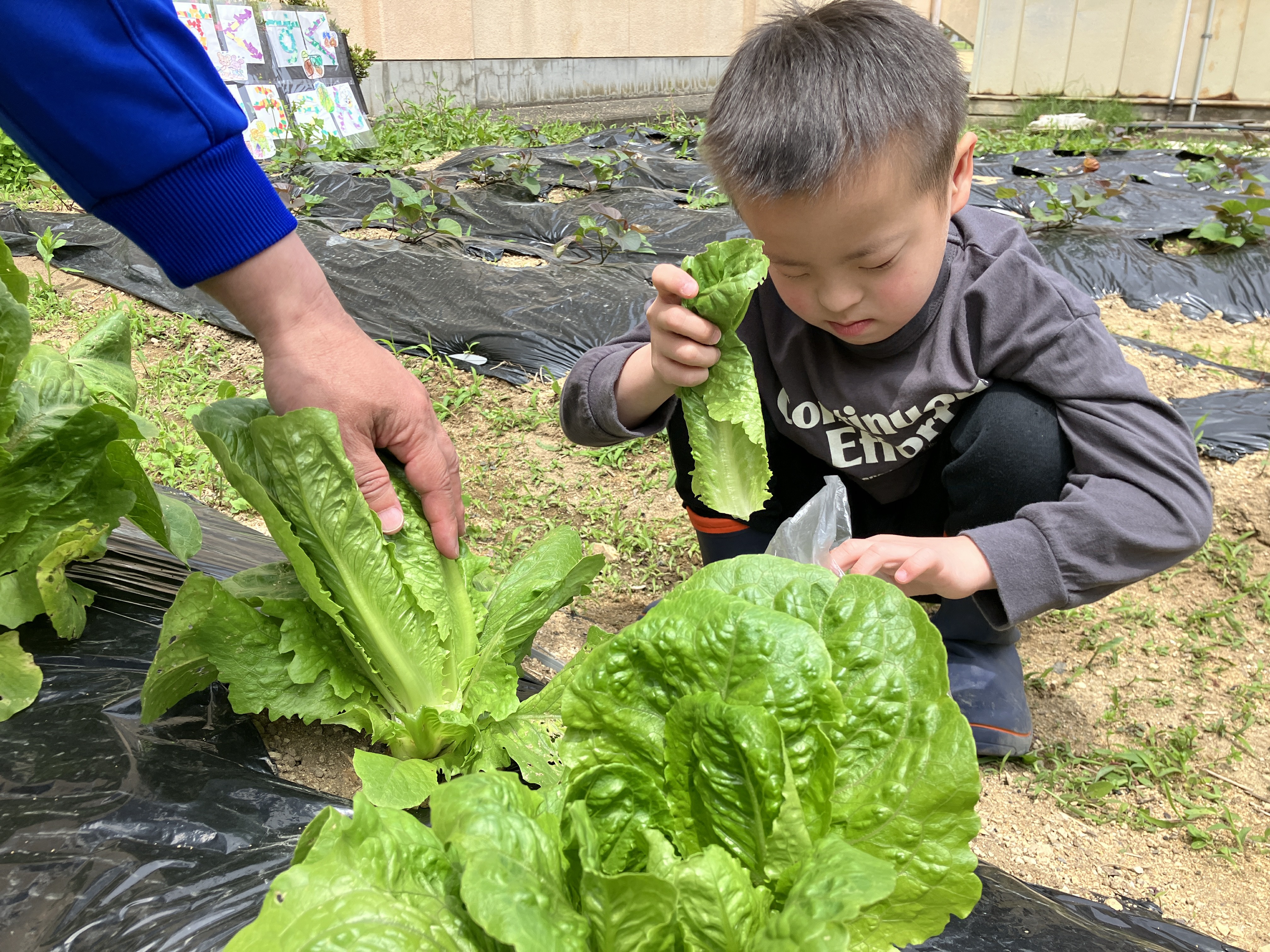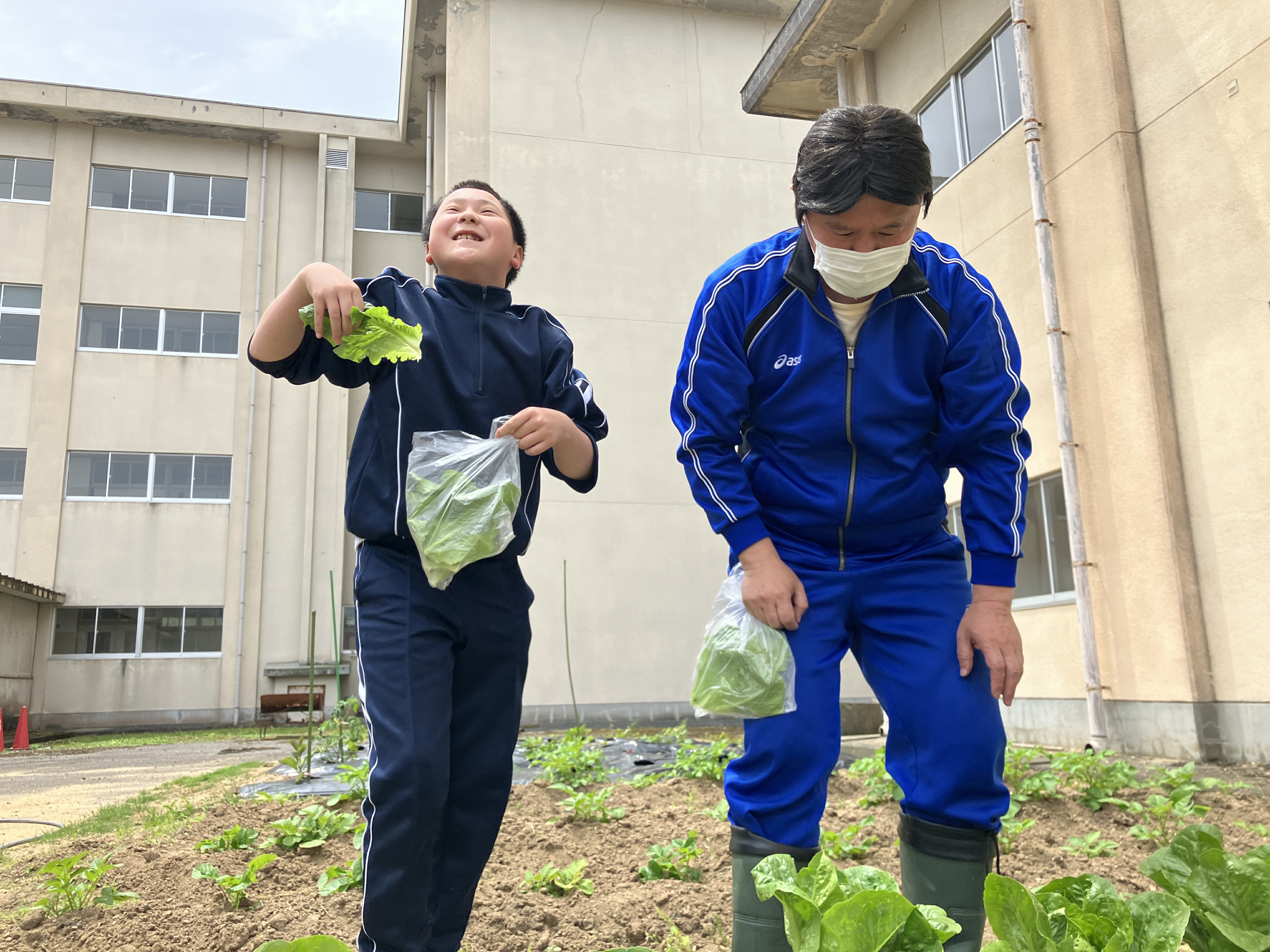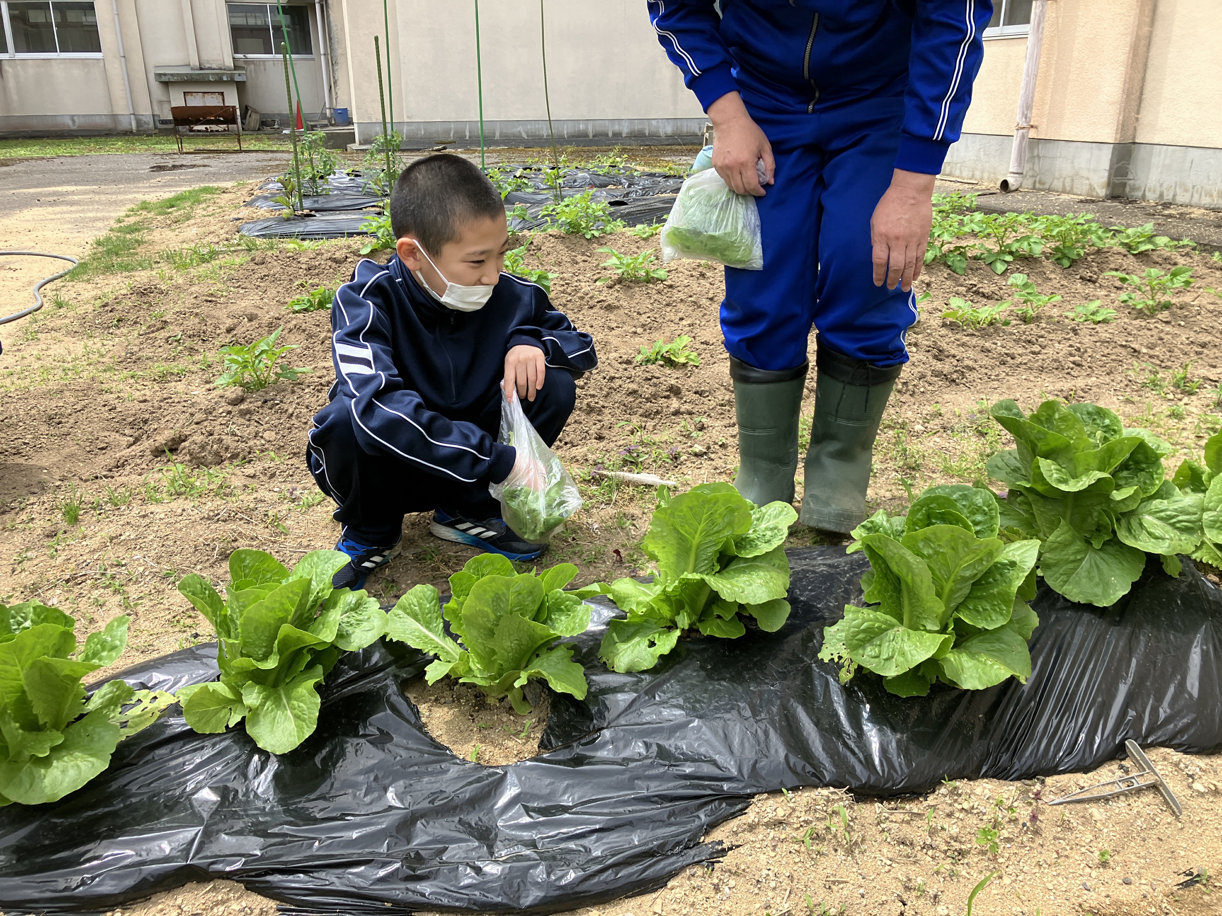 小学部のレタスが収穫を迎えました。大きくなったレタスのできるだけ根元の方をちぎって収穫しました!「お家でおいしく食べました」「お父さんお母さんも食べてくれました」と嬉しそうに教えてくれる子もいました。