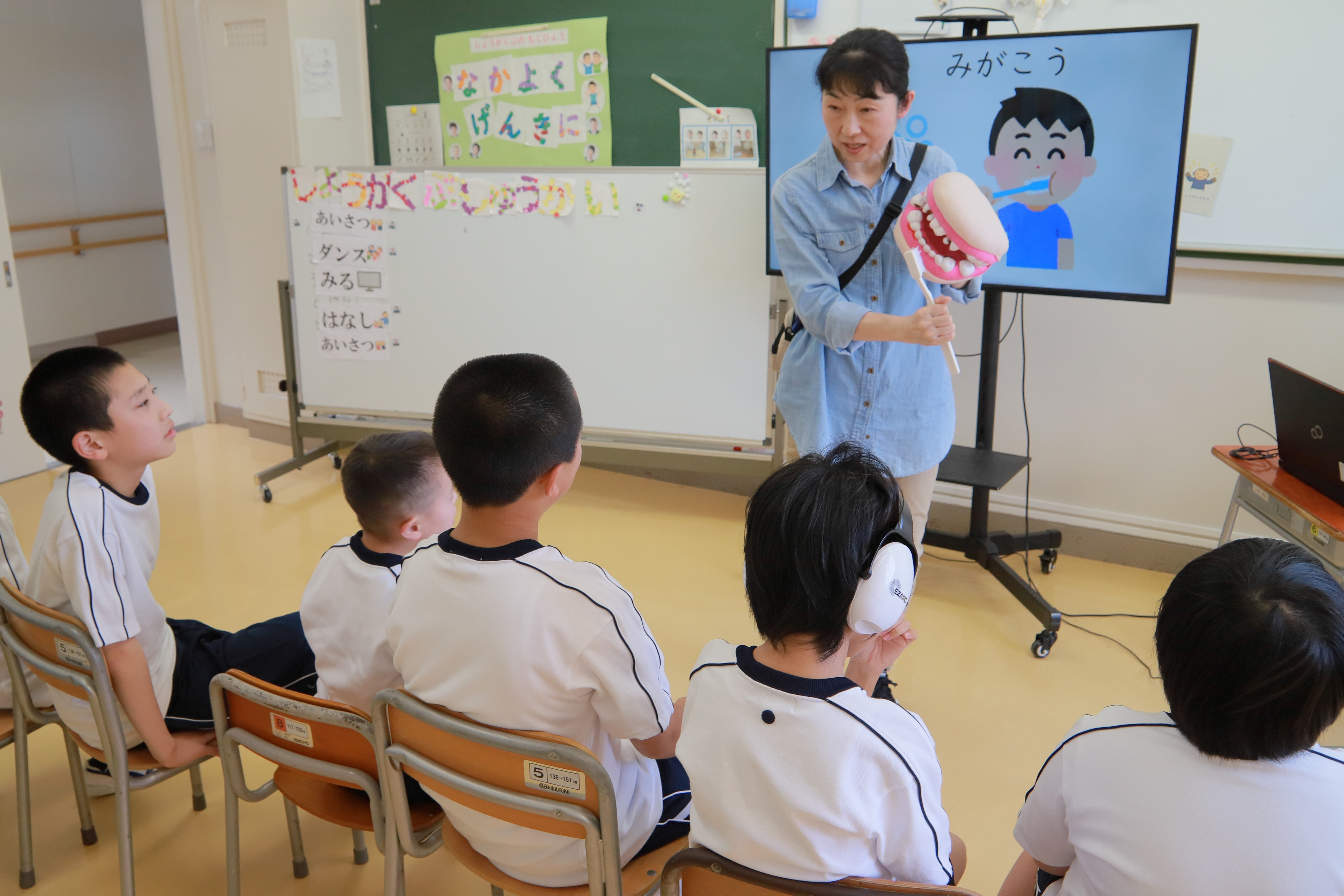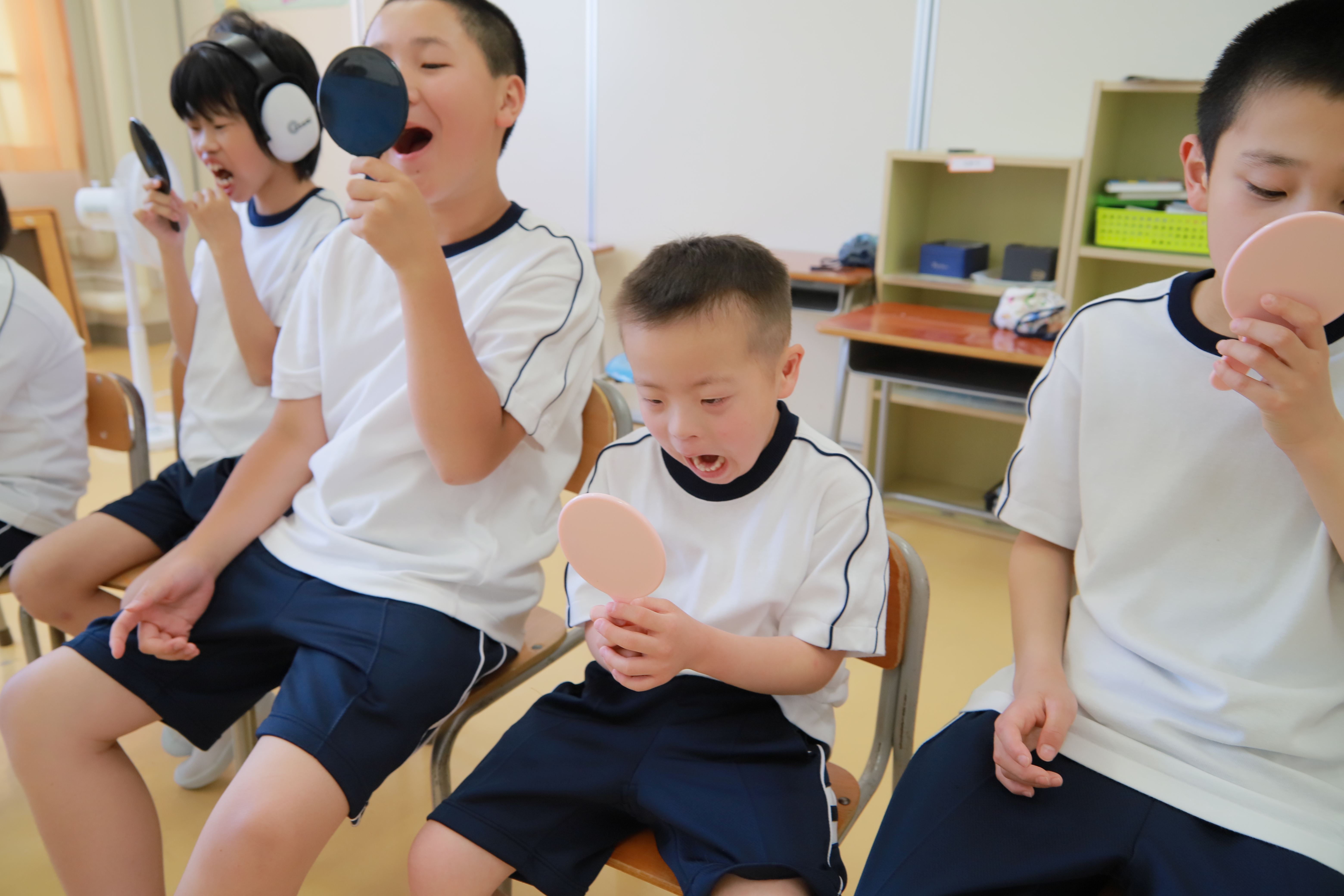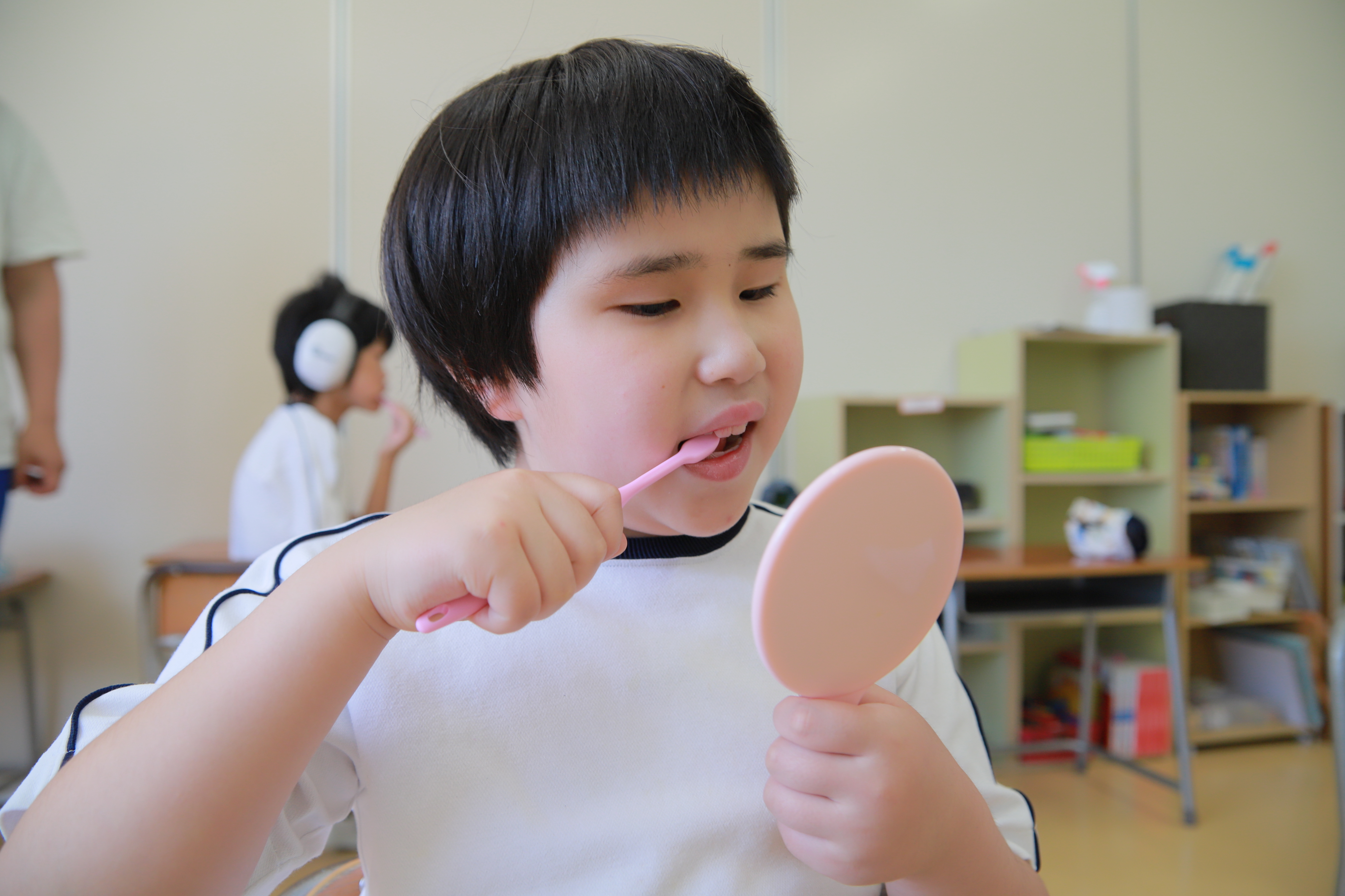 養護教諭による歯磨き指導を受けました。給食を食べて歯磨きをした後の時間でした。歯垢染め出し液(フレッシュアップル風味)をつけて,上手に歯磨きできていることや,もう少し磨かないといけないことがわかりました。手鏡を見ながらきれいに歯磨きができました!この調子で毎日の歯磨きも丁寧に頑張りましょう!