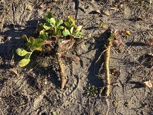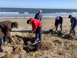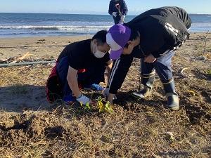 12月14日(火)、高等部農工班(4人)で学校の近くの鵜島海岸に自生しているハマボウフウを移植しました。