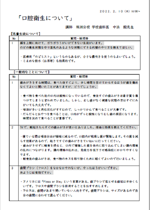 2月10日(木)に学校歯科医の中浜毅先生をお招きして、珠洲分校職員が歯科講習を受講しました。虫歯は勿論ではありますが、歯周病や噛み合わせなどが全身の病気と関係することなどについて学びました。正しい歯磨きの仕方や子供たちに対しての歯磨きの意識付けなど、今後の学習に活かしていきたいと思います。