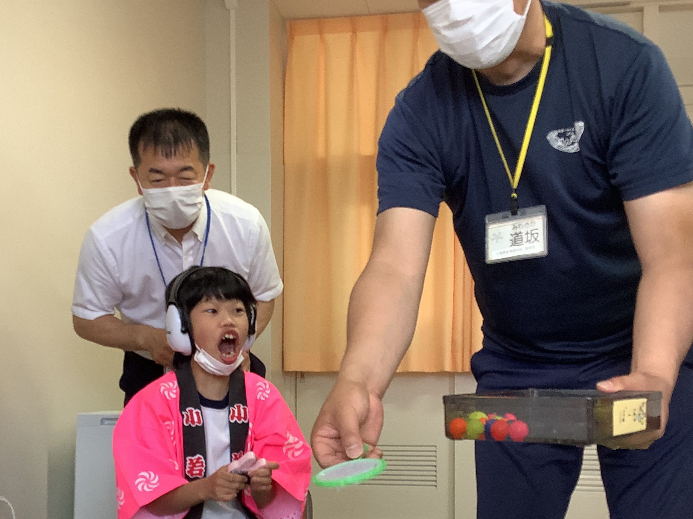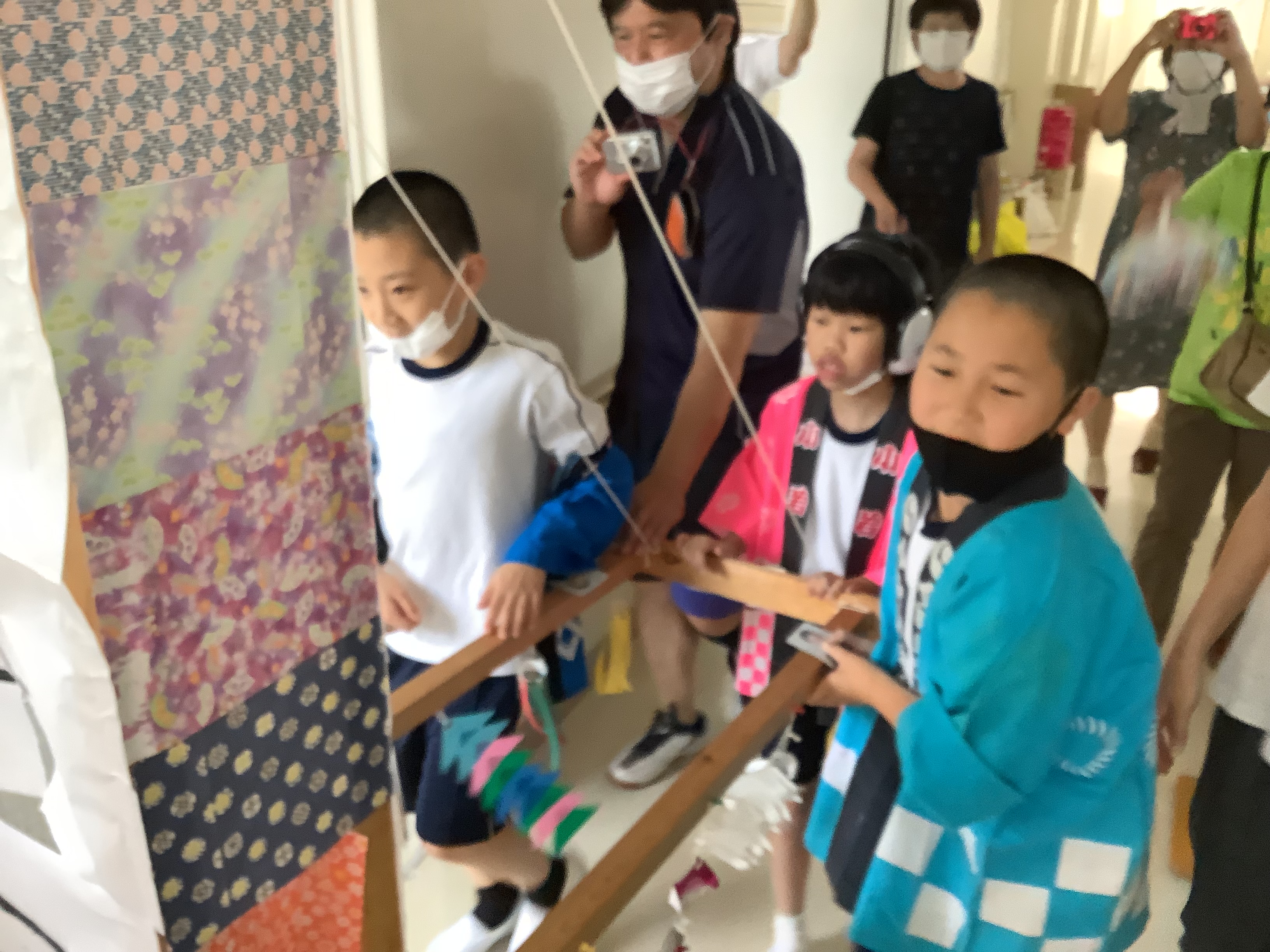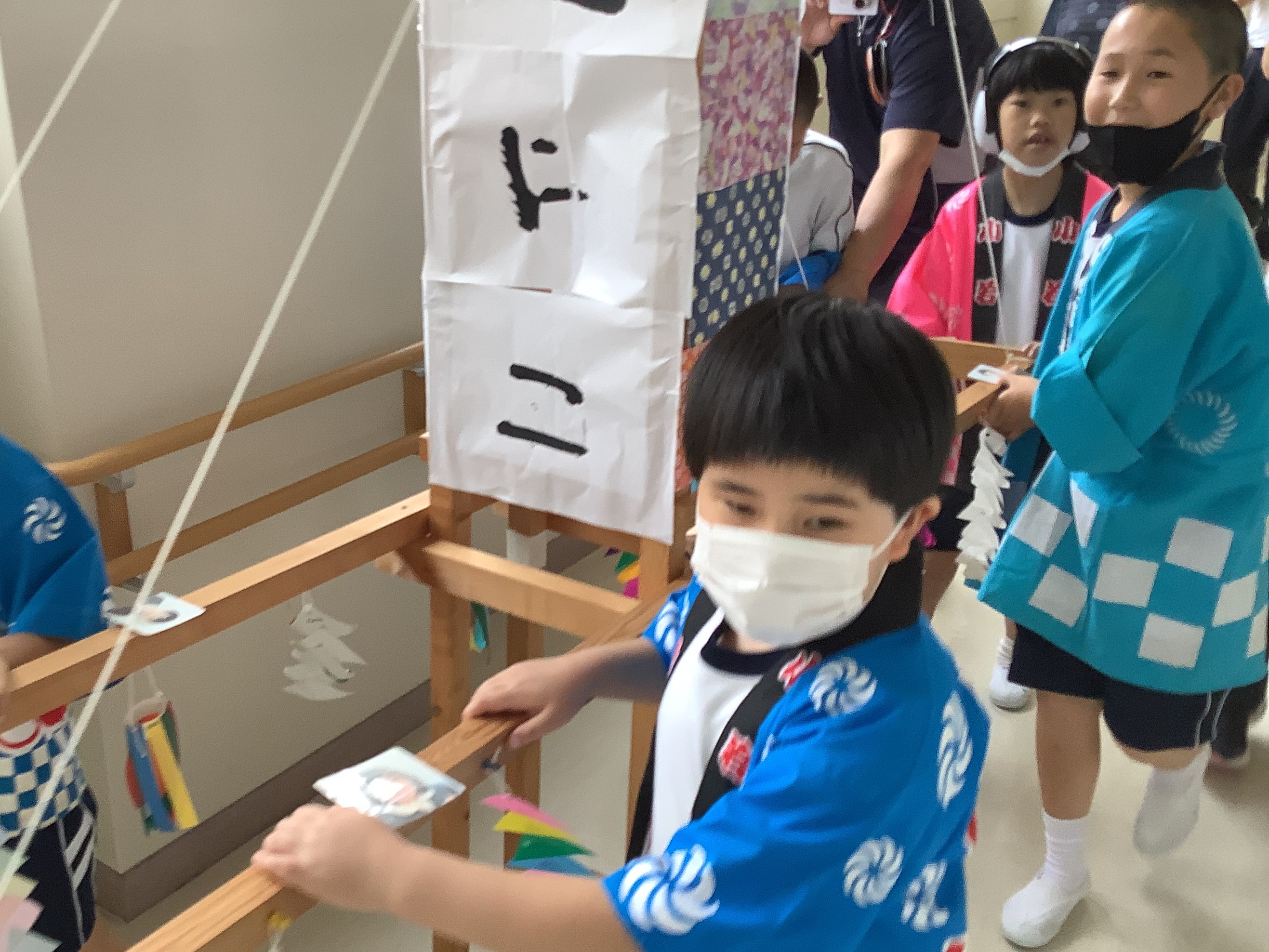 7月7日(木)に、小学部で夏祭りを行いました。法被を着て、飾ったキリコをみんなで運んだり、盆踊りをしたりと、お祭り気分を味わいました。後半は「スーパーボールすくい屋」と「くじびき屋」に分かれて、お店屋さんを行いました。お客さんとして地域の方や他学部の先生方に来ていただき、大いに盛り上がった一時でした。チケットをもらう係やボールを数える係など、それぞれの係の役割をしっかりと果たすこともできました。