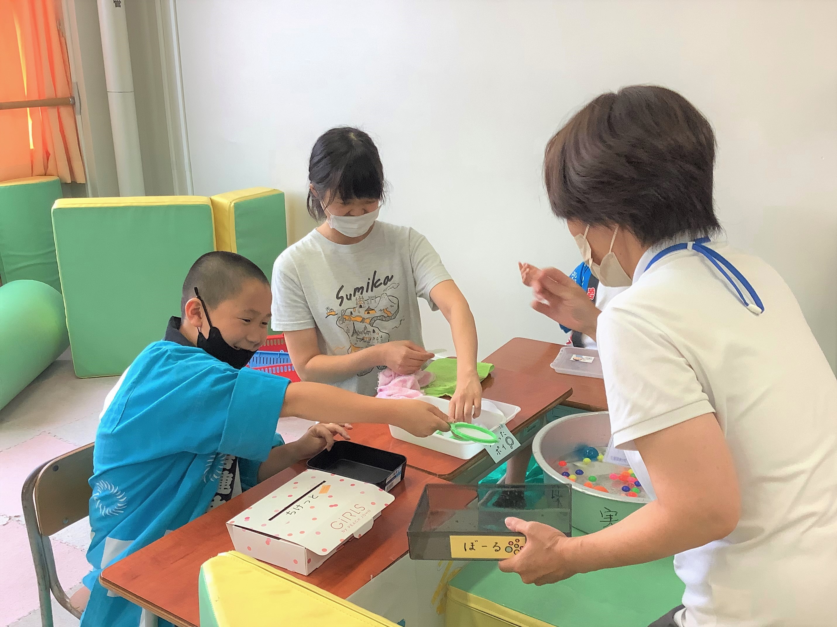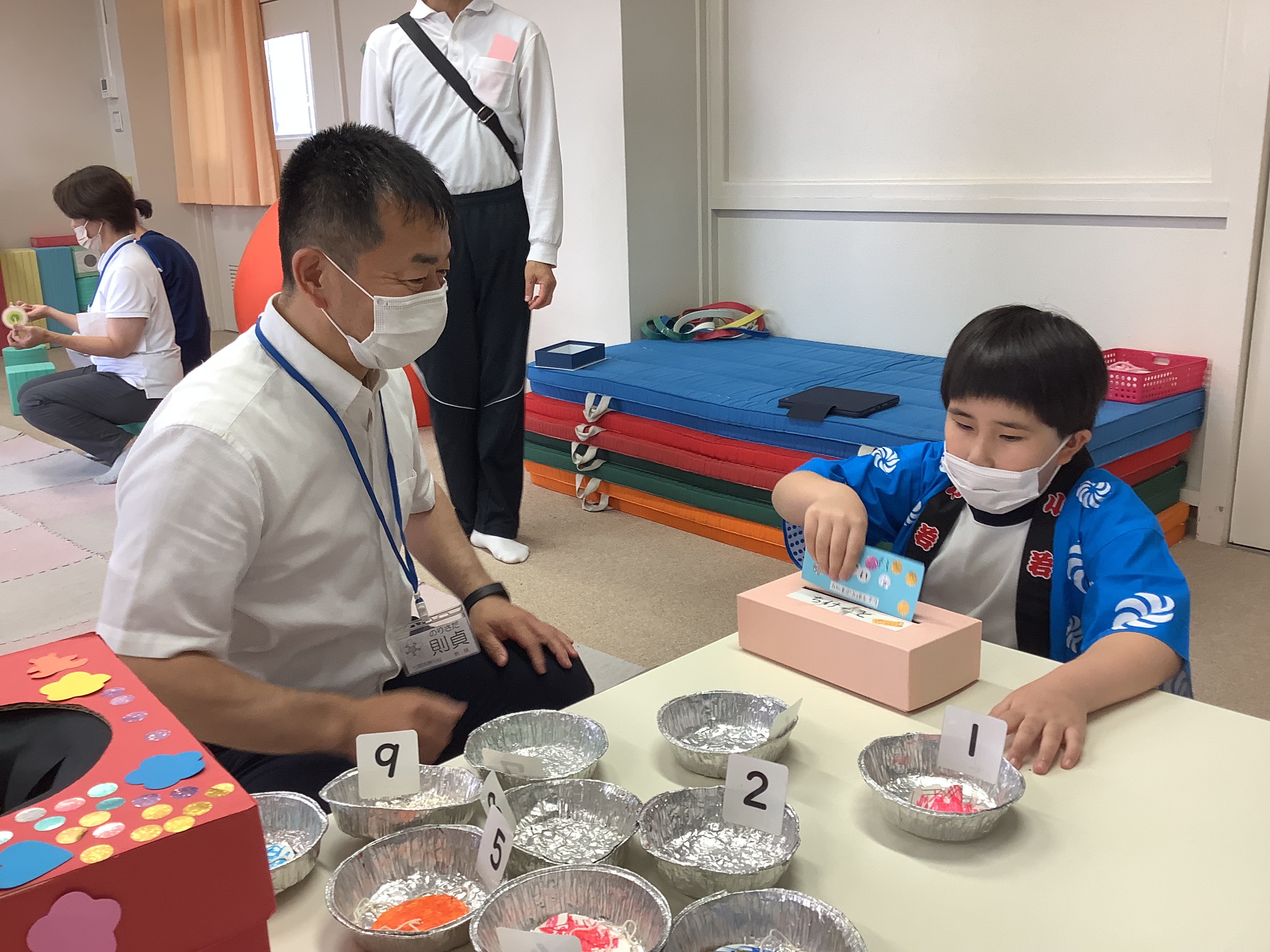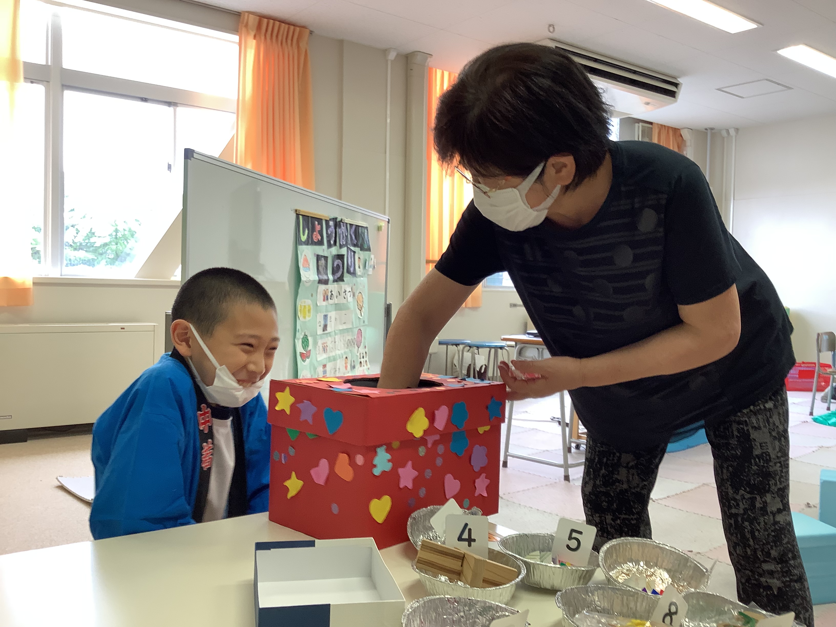 2022年7月15日 16時53分7月7日(木)に、小学部で夏祭りを行いました。法被を着て、飾ったキリコをみんなで運んだり、盆踊りをしたりと、お祭り気分を味わいました。後半は「スーパーボールすくい屋」と「くじびき屋」に分かれて、お店屋さんを行いました。お客さんとして地域の方や他学部の先生方に来ていただき、大いに盛り上がった一時でした。チケットをもらう係やボールを数える係など、それぞれの係の役割をしっかりと果たすこともできました。