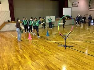 始めに、ディスクの握り方と投げ方を学び、アキュラシー(枠にシュート)や遠投に挑戦しました。子どもたちは、時間の経過とともに狙ったところへ上手に投げることができるようになりました。