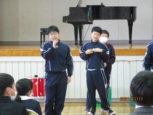 11月11日(木)、地域の特別支援学級と交流する合同学習会が3年ぶりに開かれました。みさき、若山、柳田、宝立の4校の小学校と本校の小学部、中学部が参加して行われました。発表会形式で理科や社会で学習したことや、手品なども披露されました。小学部はダンスと合奏、中学部は歌と合奏を発表しました。その後、全員で『じゃんけん列車』をして交流を深めました。