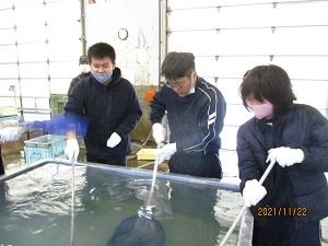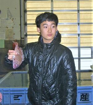 中学部は生活単元学習で、11月22日(月)に鵜飼漁港へ行ってきました。能登里山研究所の谷内口先生のお世話で、里海の学習を行いました。大きな生け簀の中の魚をたもですくったり手でつかんだりしました。魚はマダイやクロダイ、アジ、サバなど何種類もいました。魚の他にカキガイやタコ、ヌタウナギなどもいて、生徒は名前を教えてもらったり歓声をあげたりしていました。
