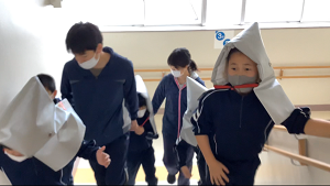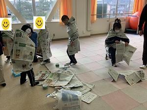 津波が来るぞ、高いところへ逃げろ!(小学部) 新聞紙で防寒具づくり(小学部)