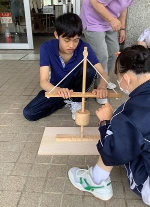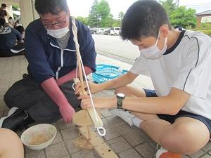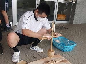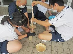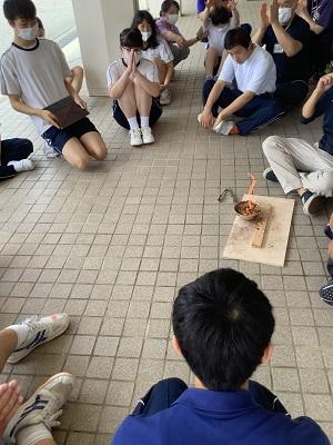 7月7日(水)、珠洲市役所より3名の達人をお招きし、「まいぎり式火起こし」に挑戦しました。はじめに達人たちによる火起こしの見本を見せていただきました。火が上がるのと同時に「おぉー」と歓声が上がり生徒たちの心にも火が付きました。さっそく、火おこしに取り掛かる生徒たちでしたが、初めて扱う火起こし器に苦戦していました。最後には、達人の指導のおかげで煙や火をおこすことに成功し生徒たちは愛おしそうに着いた火を眺めていました。