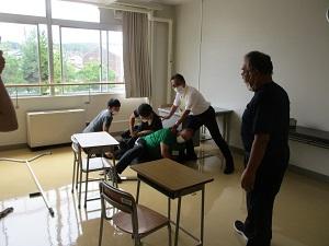 職員玄関から不審者が侵入したという内容で、不審者侵入を知らせる情報伝達、さす又を用いた犯人への対応、児童生徒の安全確保、警察への連絡など、不審者への対応を訓練しました。