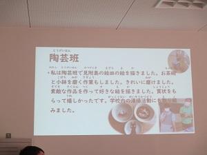 高等部では、作業学習について陶芸・工芸・食品加工・農工の班ごとに作業内容や大切なことについて発表しました。また、高等部には職場実習という外部で実際に働く機会もあることを経験した2年生が発表してくれました。